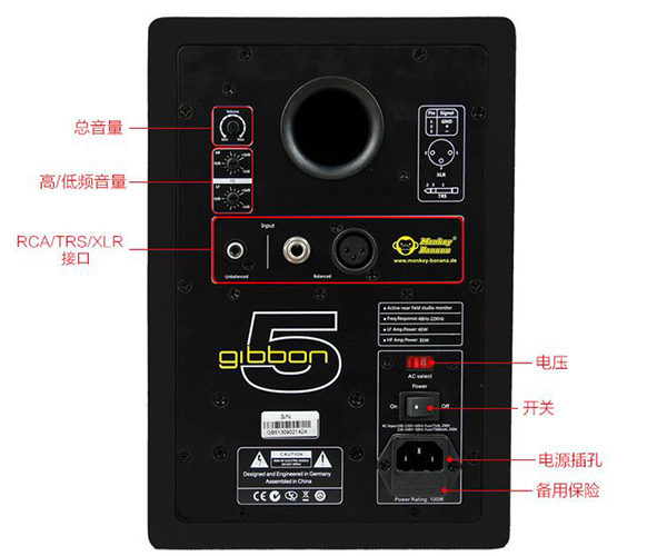 Gibbon 5配备3种常用接口(RCA/TRS/XLR),供您连接莲花口的数字设备、又可以连接卡农口或者大三芯接口的调音台、声卡等设备。